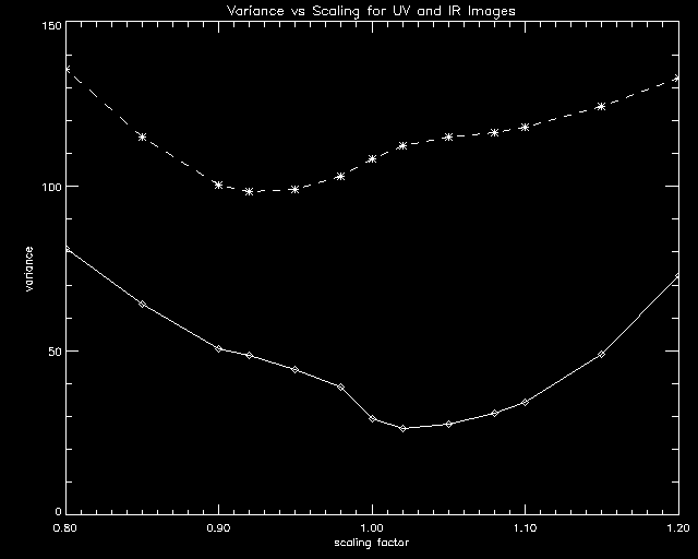 Above is a plot of the variances for the UV image and the IR image. The top line represents the UV variences and the bottom the IR. Where the minima occur is where the scale factor fits the images to one another best. The process that generated these curves was very suspect, as we seemed to have too much control over the shape of the graph. Because when whe took the variance over the whole image the graph closely resembeled an exponential curve with no clear minimum, we tried various box sizes in an attempt to get a coherant result. These curves used a 200 square pixel section and 150 square pixel section respectivly. The minima are appearantly near .92 for the UV and 1.02 for the IR. I cannot really say that the answers above are of any concequence because of the erratic behavior based of box sizes. I truly believe that given enough time, I could have found nearly any value for the minimum by choosing the correct box size and location of the image.